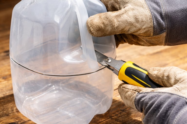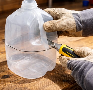 Take your scissors or box cutter and cut horizontally around the jug about 3-4 inches from the bottom. Here's the important part: don't cut all the way around. Leave about 2 inches uncut near the handle area—this creates a "hinge" so the top and bottom stay connected.